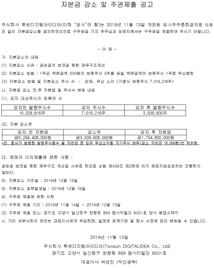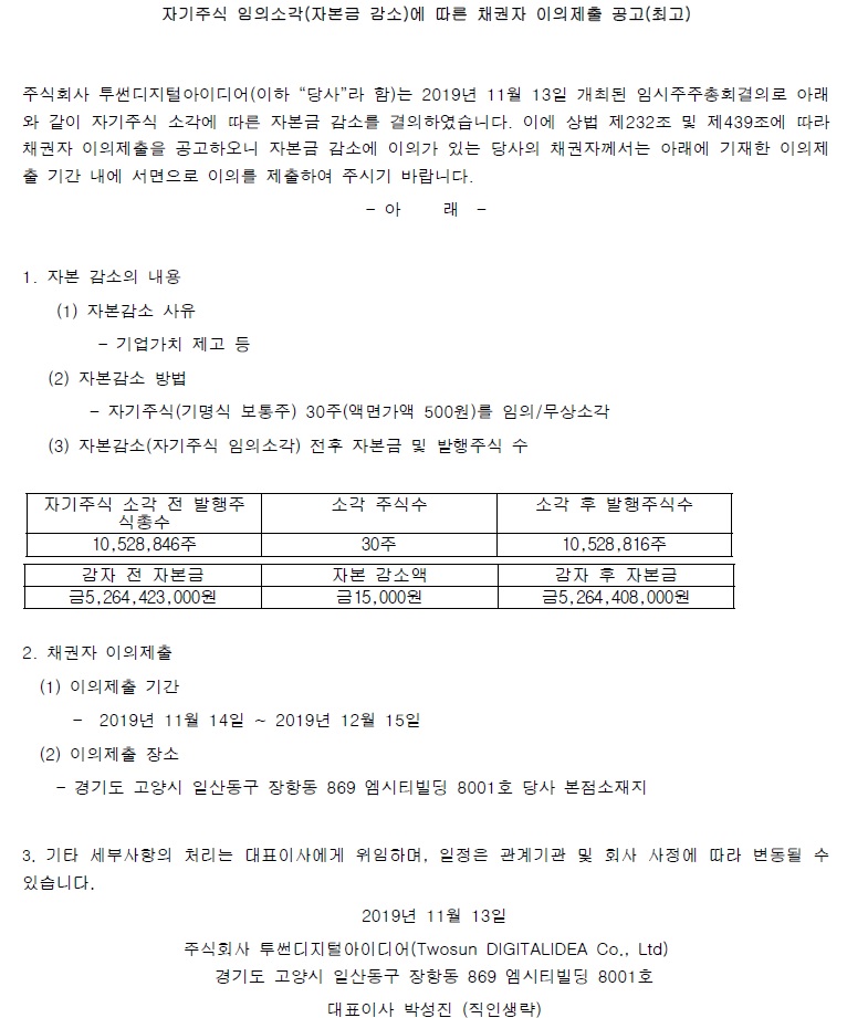 자기주식 임의소각(자본금감소)에 따른 채권자 이의제출 공고(최고)