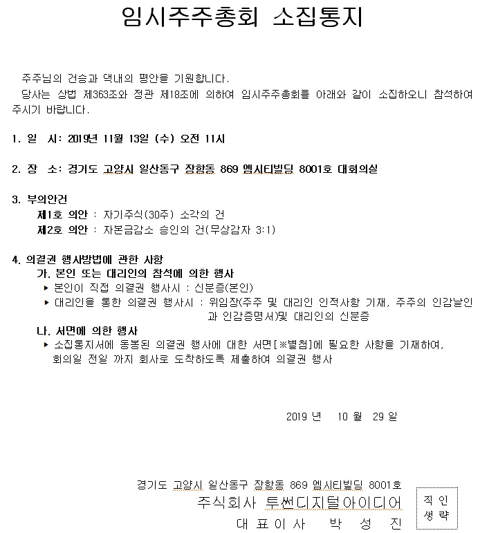 2) 정기 주주총회 장소: 경기도 고양시 일산동구 백마로 195 엠시티빌딩 8001호